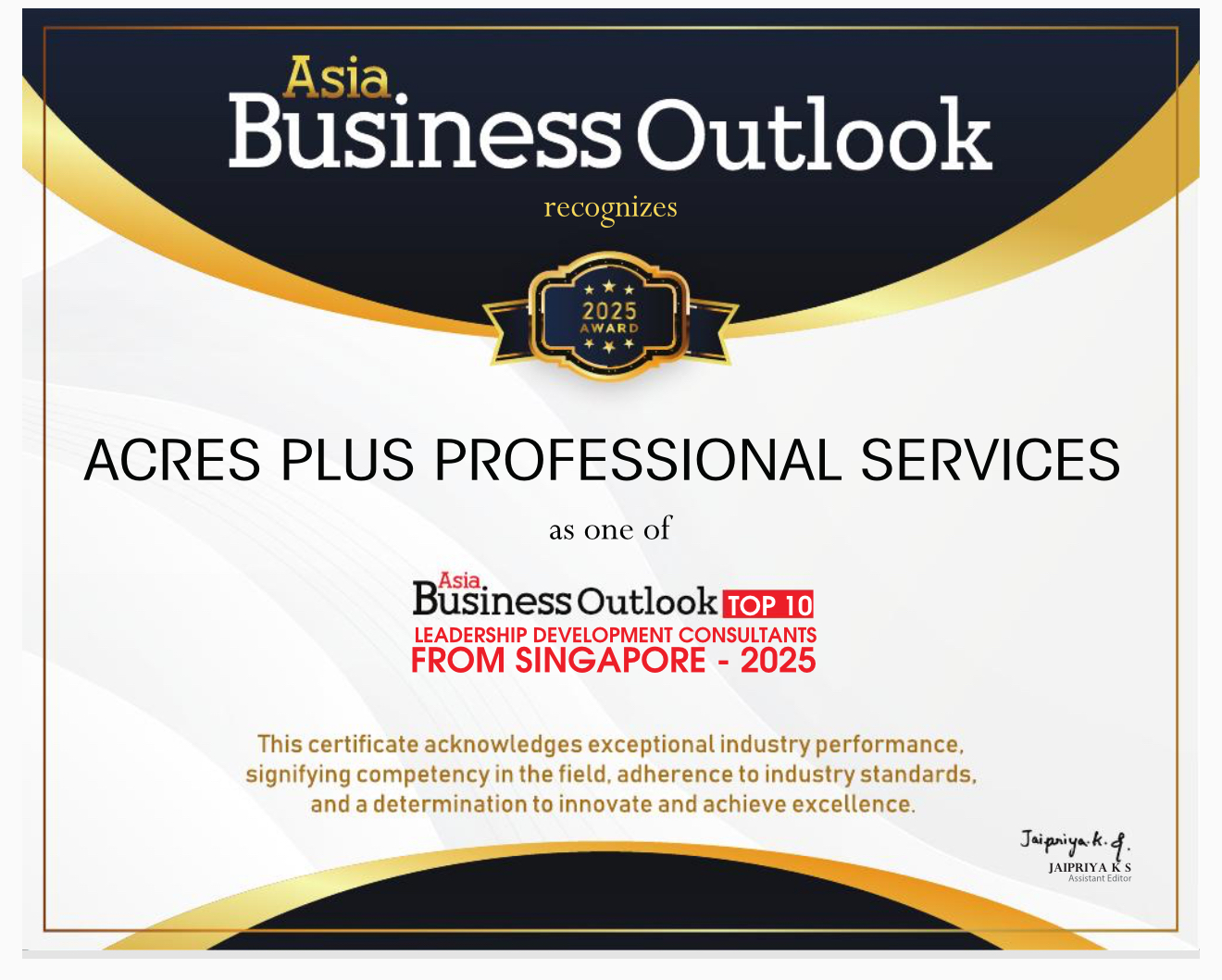 I, as Founder of Acres Plus Professional Services, have been recognised, by Asia Business Outlook as one of the Top 10 Leadership Development consultants in Singapore – 2025.